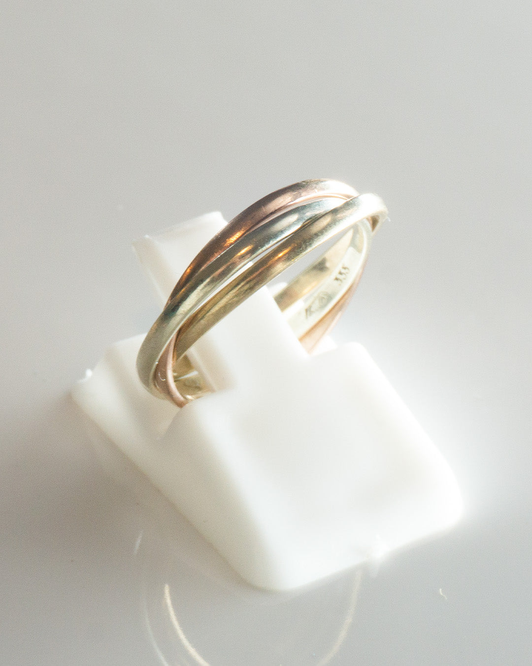 Tic Tac Toe Ring is a vintage trinity band crafted in 8K yellow, rose, and white gold (stamped 333), size 47.5. Its interlacing bands create a playful yet timeless design. This pre-loved piece symbolizes unity and balance, a golden game of elegance across three shades of love.
