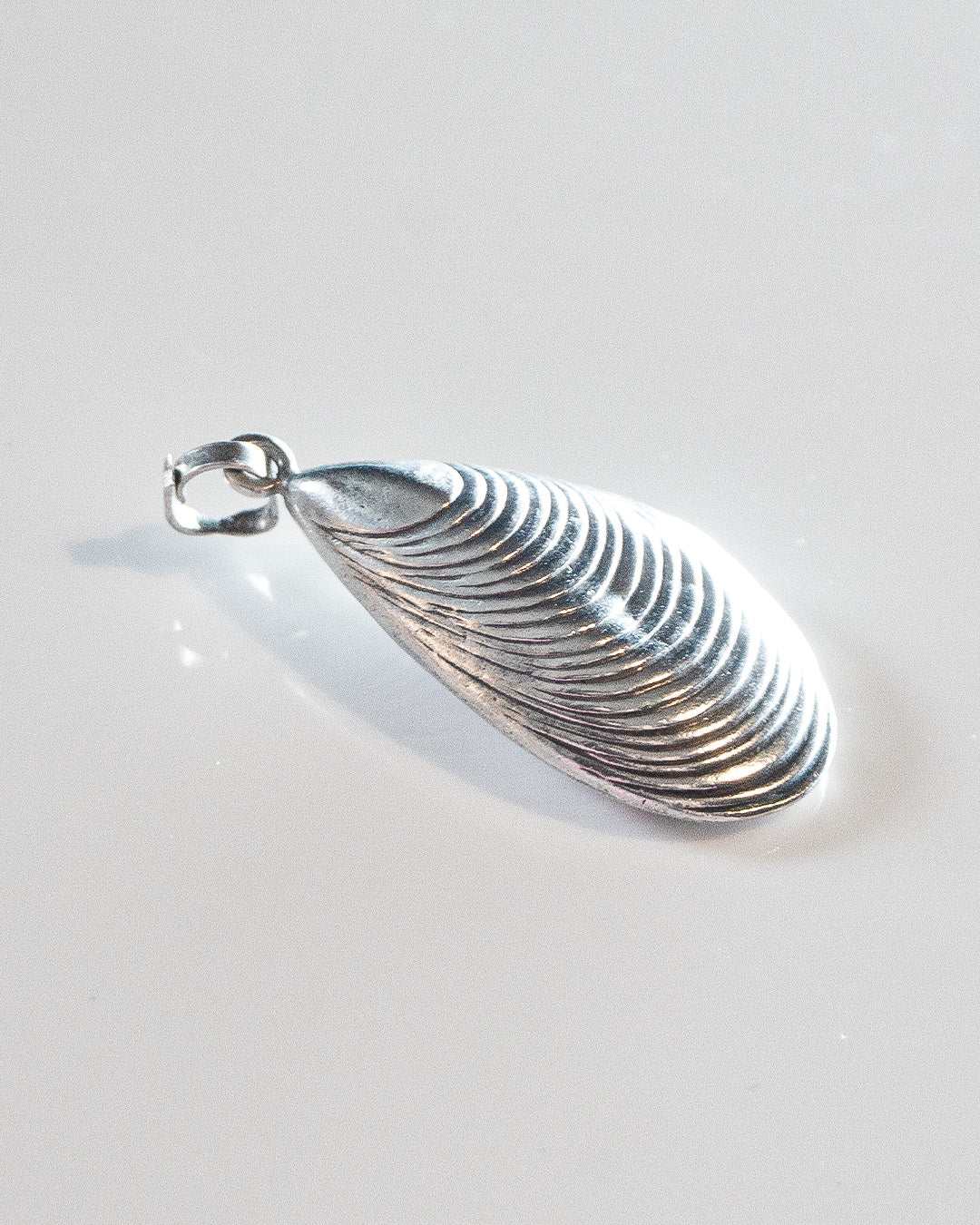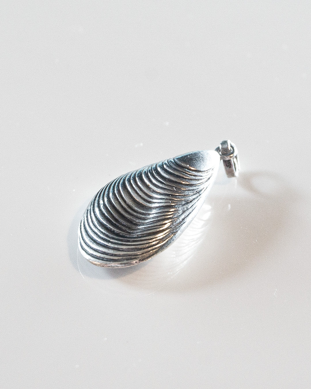 The Devil Wears Shellfish is a vintage silver charm shaped like a closed mussel, sleek, mysterious, and quietly glamorous. This pre-loved piece adds oceanic attitude and haute shell couture to your charm game.